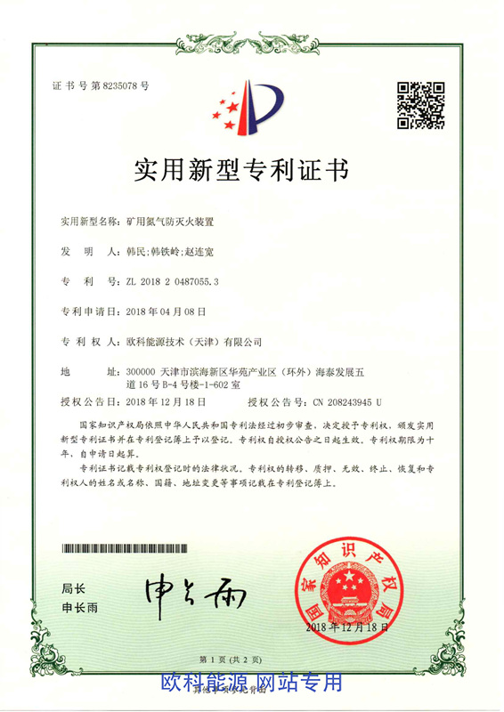 Utility Model Patent Certificate (Mining Nitrogen Fire Extinguishing Device)