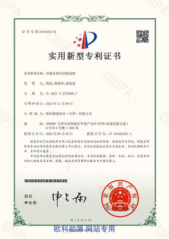 Utility Model Patent Certificate (Condensed Water Pressure Recovery Device)