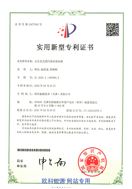 Utility Model Patent Certificate (Venturi Steam Silencer Mixer)