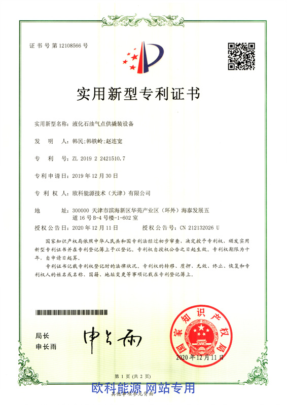 Utility Model Patent Certificate (Liquefied Petroleum Gas Point Supply Skid Mounted Equipment)